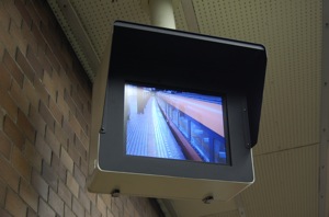 ホームの壁に留めたモニターハウジングです。 ホーム幅も狭く、ホーム屋根の低い駅では、壁にモニターハウジングを取り付けました。 |